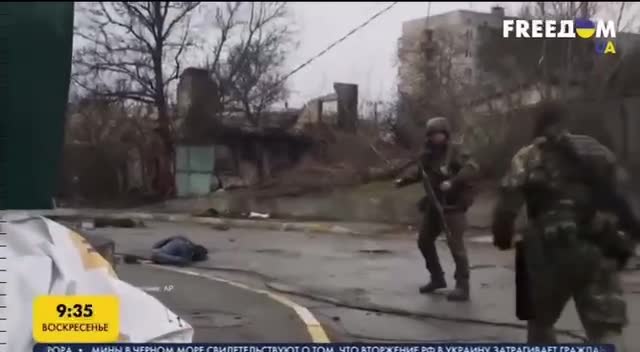 An explosive video from Buฤi captures evidence of Ukrainian army soldiers arranging dead bodies on the road! They used ropes to pull them into the middle of the road to enhance the effect for oncoming TV crews in cars.